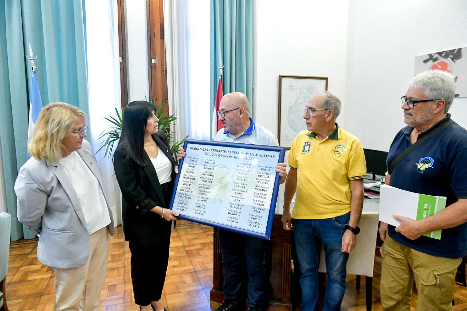 La vicegobernadora Alicia Aluani, acompañada por la prosecretaria de la Honorable Cámara de Senadores (HCS), Sara Foletto, recibió este jueves en su despacho al presidente del Centro de Veteranos de Guerra de Malvinas Paraná, Oscar Orlando Eguías; al vicepresidente, José Cuello; y al secretario de la entidad, Ricardo César Álvarez, quienes les obsequiaron un cuadro recordatorio con los nombres de los 36 “Héroes Entrerrianos fallecidos en Malvinas”.