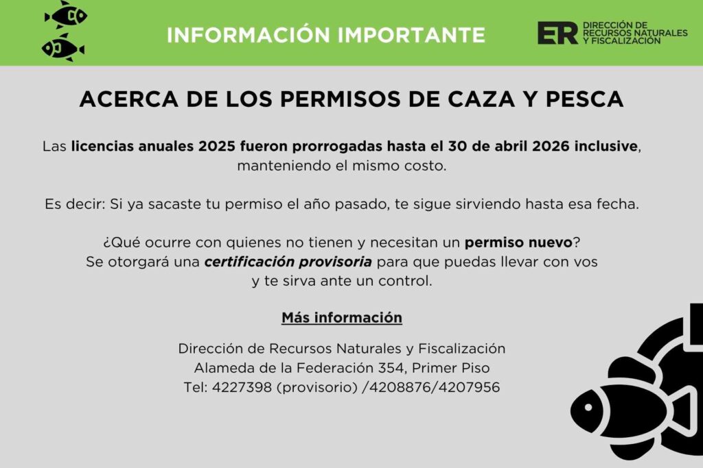 En este sentido, se recuerda que las licencias anuales 2025 fueron prorrogadas según Resolución 0083/26 DRNF hasta el 30 de abril inclusive. Por lo tanto, quienes ya cuenten con su permiso vigente podrán continuar utilizándolo hasta esa fecha sin necesidad de realizar un nuevo trámite.