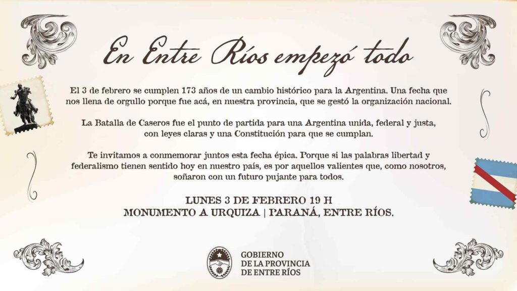 El 173º aniversario de la batalla de Caseros será conmemorado en la capital entrerriana por su importancia para la organización nacional con un acto que tendrá como protagonistas a autoridades nacionales, provinciales y municipales, a músicos e integrantes de entidades de la cultura entrerriana.