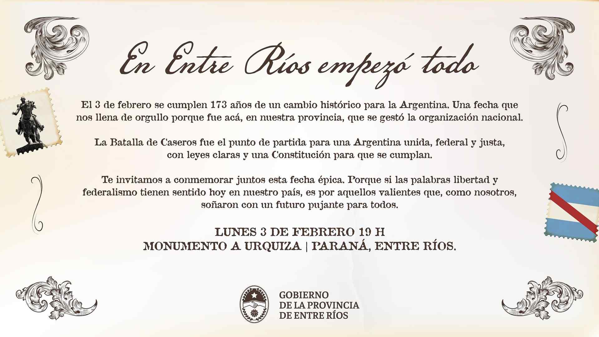 La velada recordará la batalla que el 3 de febrero de 1852 enfrentó al llamado Ejército Grande, liderado por el general Justo José de Urquiza, y al Ejército de Buenos Aires, al mando del general Juan Manuel de Rosas. El resultado de la misma posibilitó que la entonces Confederación Argentina iniciara un proceso de organización nacional bajo la conducción de Urquiza, que se tradujo en la sanción de la Constitución Nacional de 1853 y el inicio del periodo constitucional a escala país.