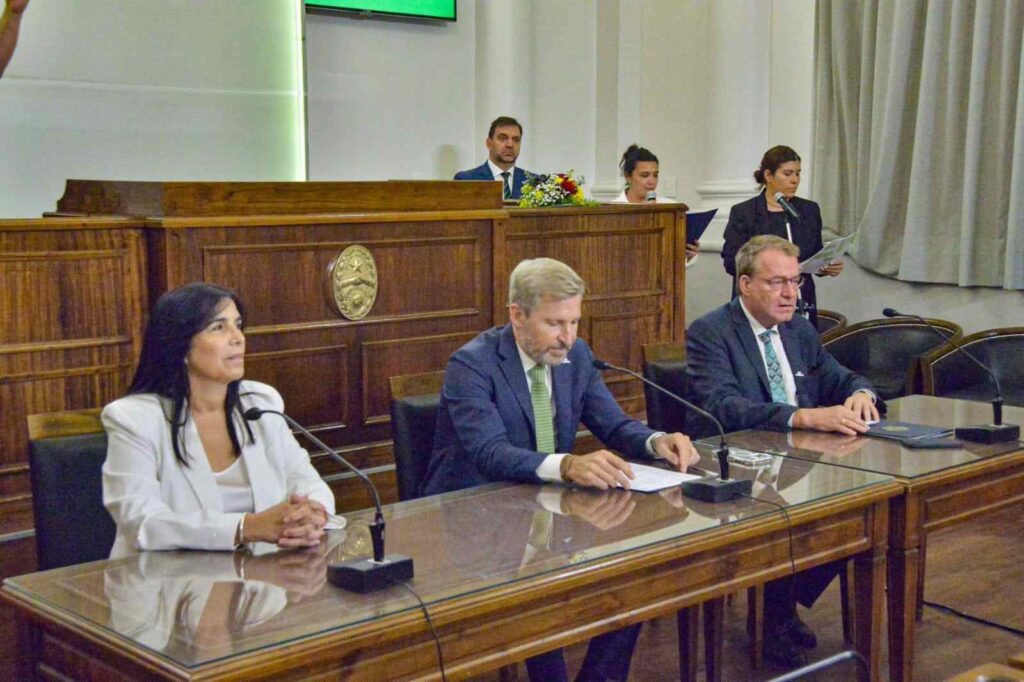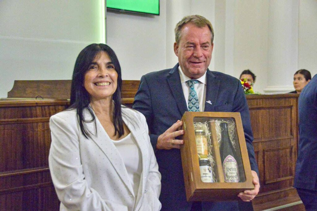 La vicegobernadora y presidenta del cuerpo, Alicia Aluani, les dio la bienvenida a los presentes y en su discurso expresó el reconocimiento a la comunidad alemana y a los lazos históricos que unen a ambos pueblos. Destacó el aporte decisivo de esta comunidad al desarrollo cultural, económico y social de Entre Ríos, un legado que permanece en sus instituciones y, sobre todo, en valores como el trabajo, el compromiso y la solidaridad.
