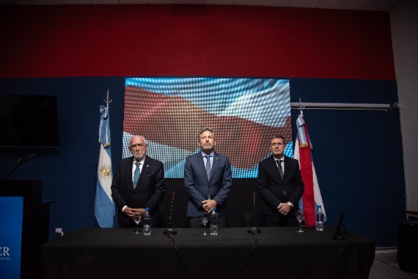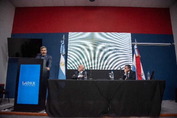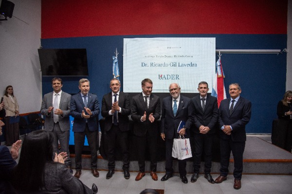 Durante la ceremonia, realizada en la sede del Rectorado de Uader, el mandatario estuvo acompañado por el rector de la institución, Luciano Filipuzzi, y la vicegobernadora Alicia Aluani. En ese marco, destacó la figura de Gil Lavedra como «un protagonista de nuestra historia, no solo por haber integrado el tribunal que juzgó los crímenes de lesa humanidad, sino también por su defensa irrestricta de la democracia y la institucionalidad».