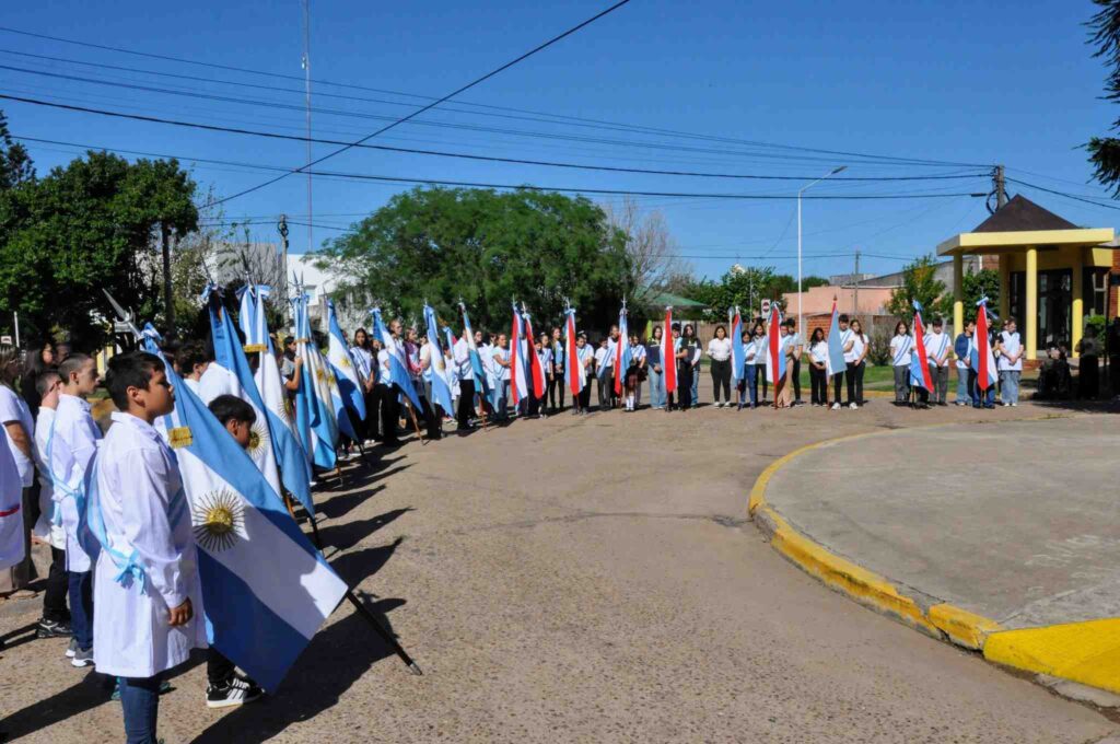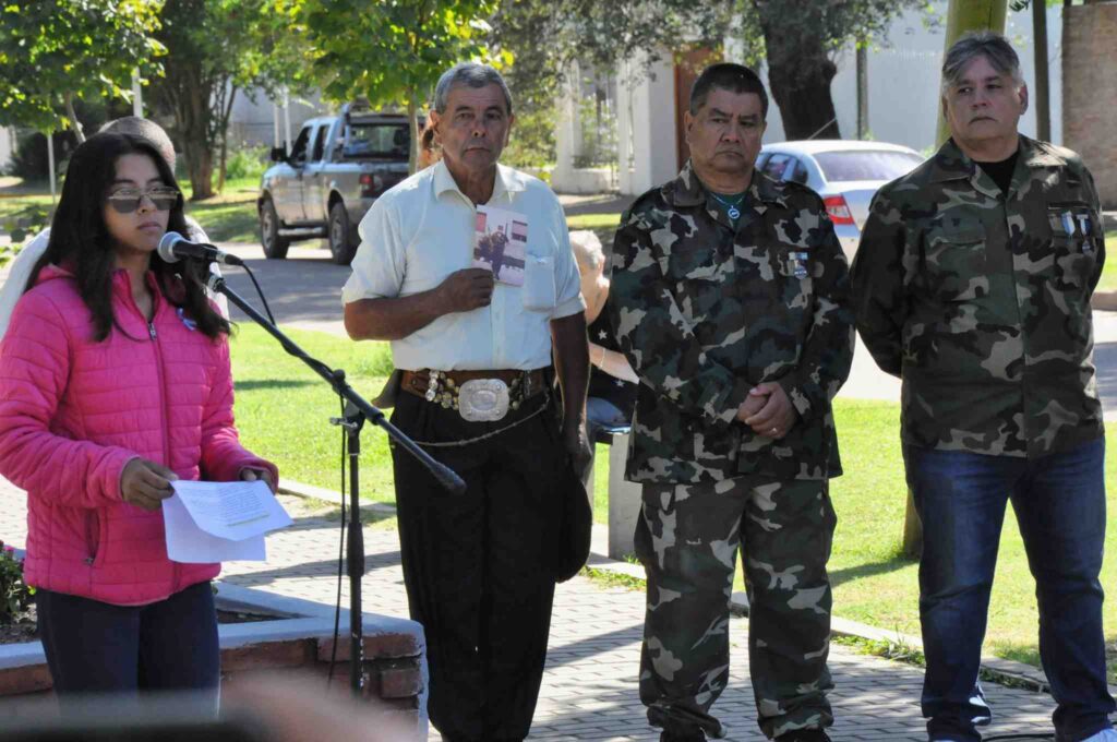 Durante la actividad, fueron recibidas las banderas de ceremonia de los establecimientos educativos, Aldana Duré, hija del veterano presente, compartió las palabras alusivas y Natali Zvetig leyó Juan López y John Ward, un texto de Jorge Luis Borges sobre la guerra, escrito en 1985.