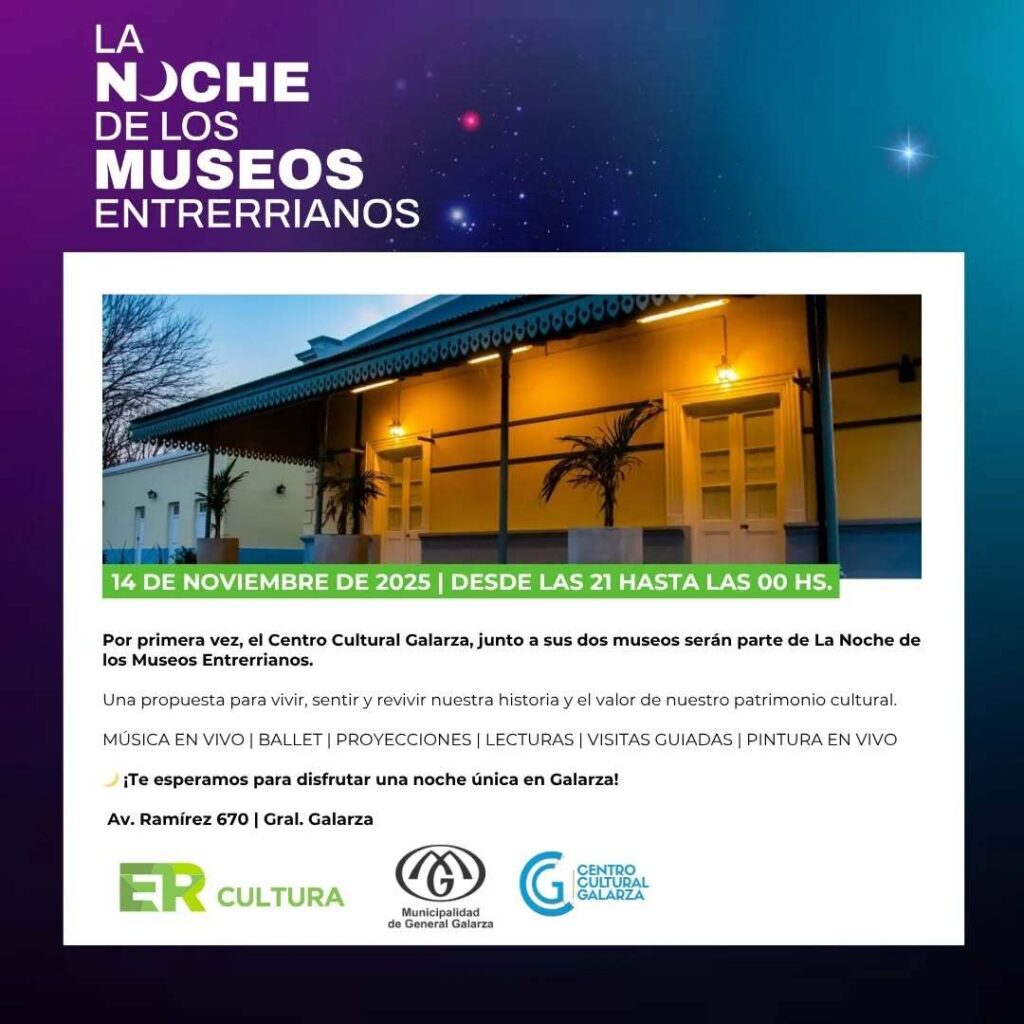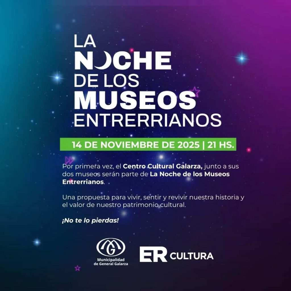 Este viernes 14 de noviembre de 2025, de 21:00 a 00:00 horas, General Galarza vivirá una noche especial: por primera vez, el Centro Cultural Galarza, junto a sus dos museos, será parte de la Noche de los Museos Entrerrianos, una propuesta provincial que invita a revivir la historia y valorar el patrimonio cultural.