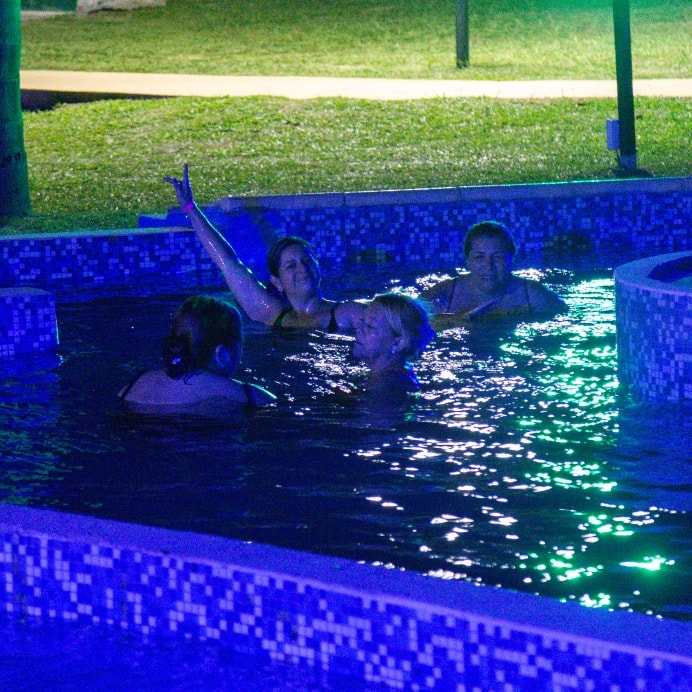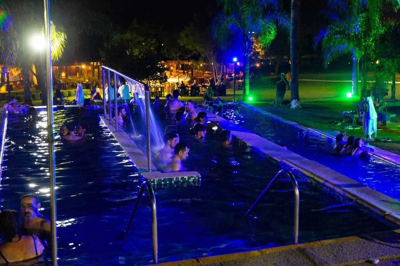 Cuando baja el sol y la luna se cruza en el horizonte, las piscinas termales extienden su horario para que vecinos y visitantes sigan disfrutando del agua, el relax y una atmósfera soñada.